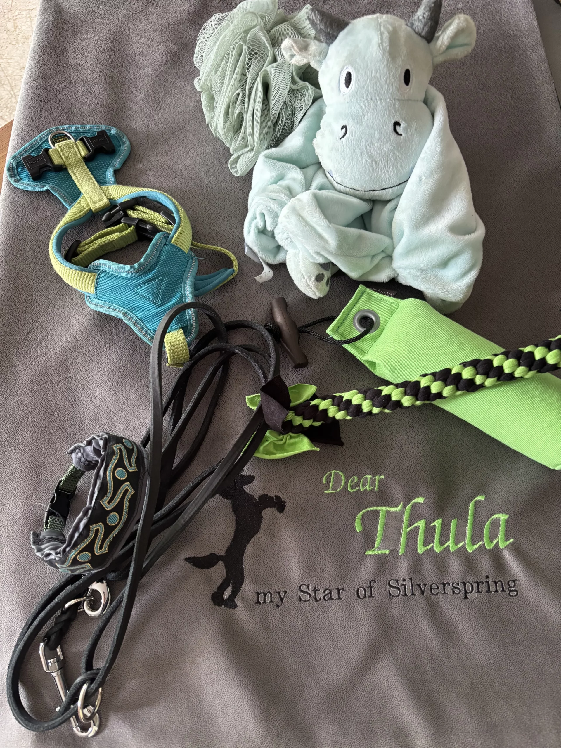 Ein herzliches Dankeschön geht an die Deckrüdenbesitzerin für die liebevoll angefertigten Halsbänder sowie an Andrea für die traumhaft schönen, bestickten Decken – beides begleitet die Kleinen nun auf ihrem weiteren Weg.