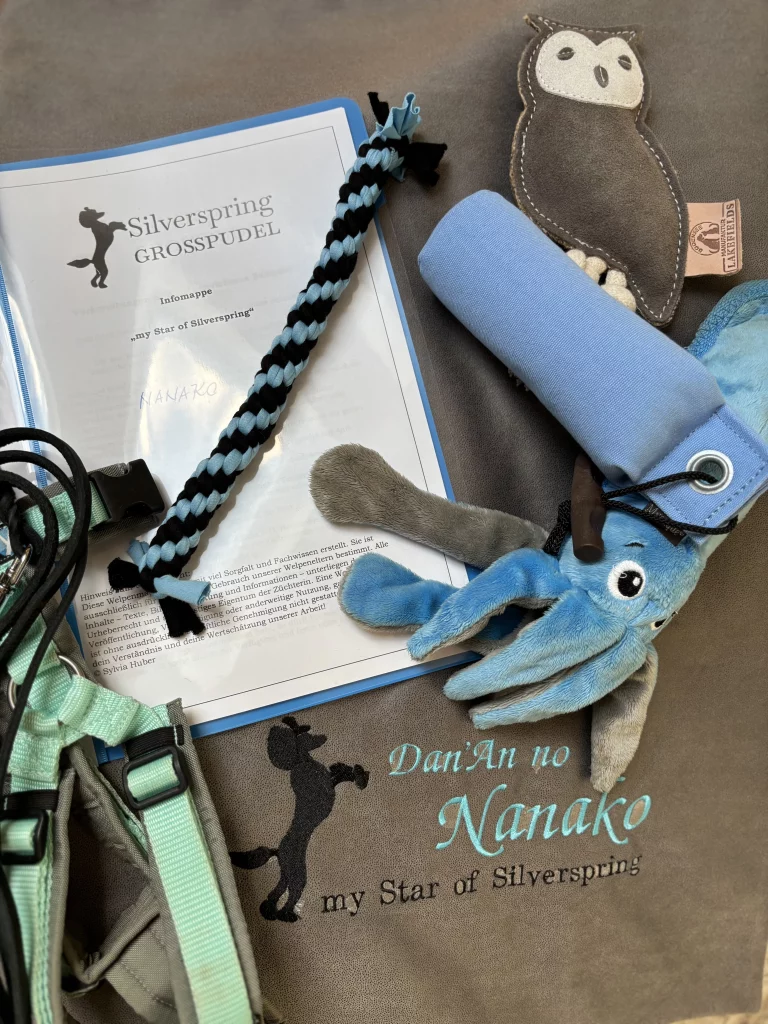 Die kleine Nanako (türkis) fährt ebenfalls Richtung Hamburg zu unseren lieben Welpeneltern Denise und Hanno mit Hanabi (gelb) aus unserem C-Wurf 2022.